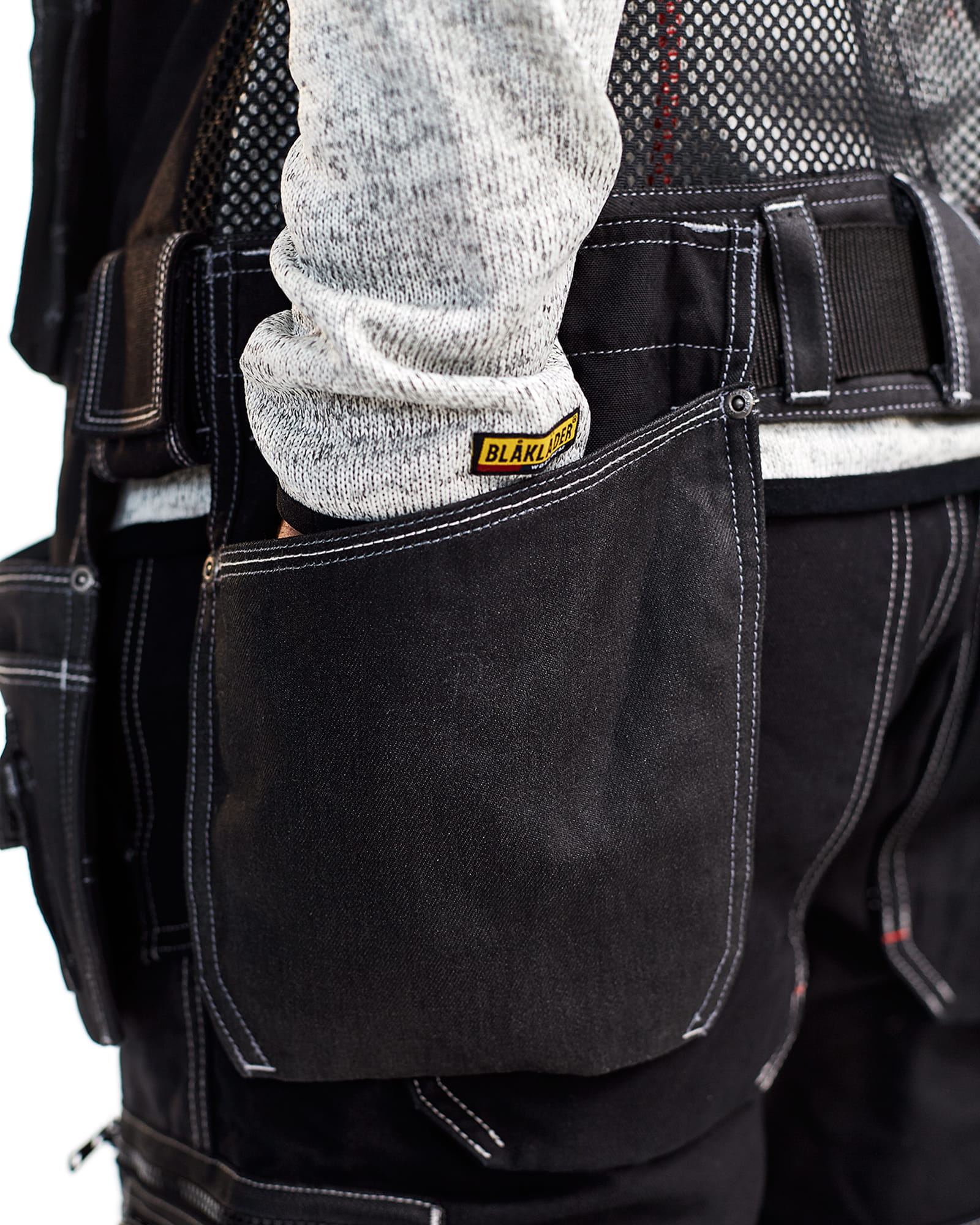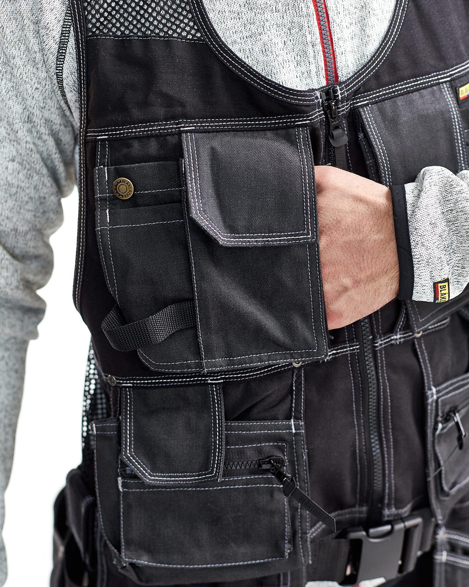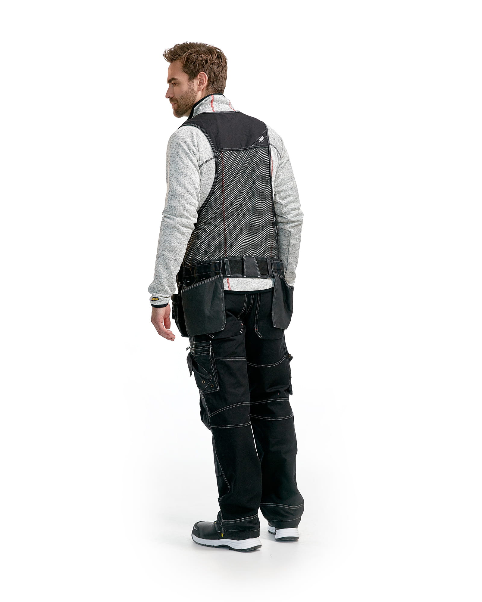 Nowoczesna kamizelka robocza z praktycznymi kieszeniami na narzędzia i akcesoria. Wyposażona w odpinane kieszenie na gwoździe i regulowany pasek w talii odciążający barki i szyję. Podwójne suwaki umożliwiają dopasowanie szerokości. Wstawki z elastycznej siatki zapewniają lekkość i dobrą wentylację podczas intensywnej pracy.