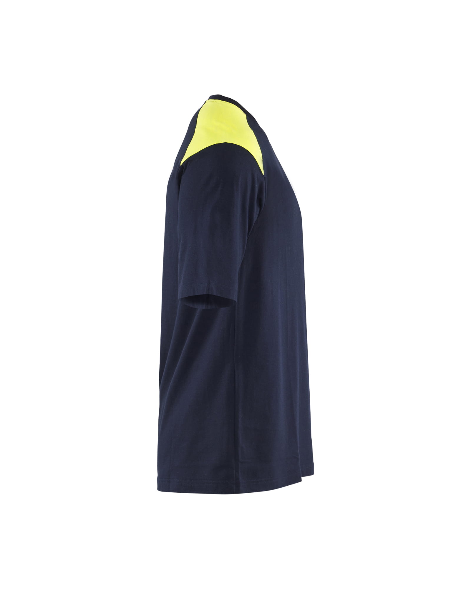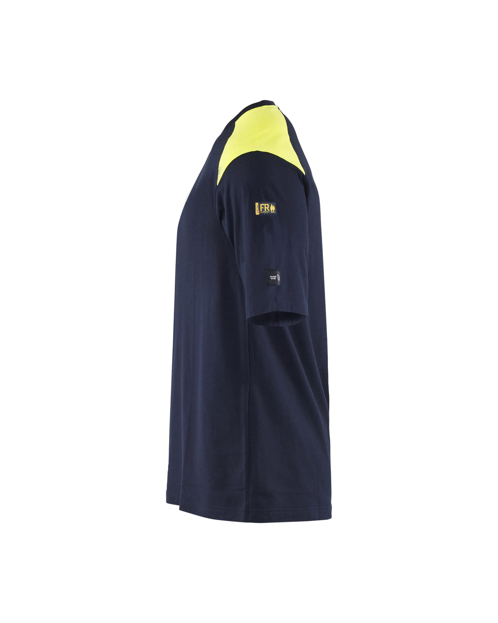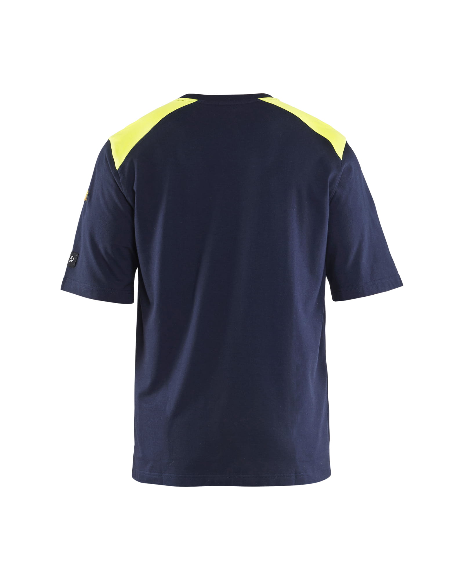 Ognioodporna koszulka wykonana z elastycznej tkaniny o splocie dżersejowym z inherentnymi właściwościami trudnopalnymi. Wyposażona w żółte wstawki na ramionach zwiększające widoczność oraz okrągły dekolt ze wzmocnionymi szwami przy szyi i ramionach. Certyfikowana normami EN 1149-5 i EN ISO 14116 zapewniającymi ochronę w środowiskach zagrożonych zapłonem.