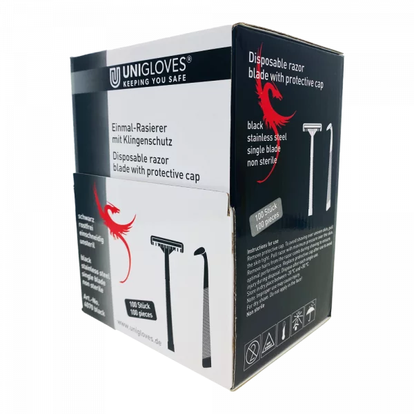 Jednorazowa maszynka do golenia jest szczelnie zamknięta ochronną nasadką. Ten niejałowy produkt idealnie nadaje się do usuwania włosów na mokro i na sucho. Maszynki do golenia zapakowane są w praktyczne pudełko z klapką umożliwiającą ich wyjęcie. Maszynka do golenia dostępna jest w kolorze niebieskim i czarnym.